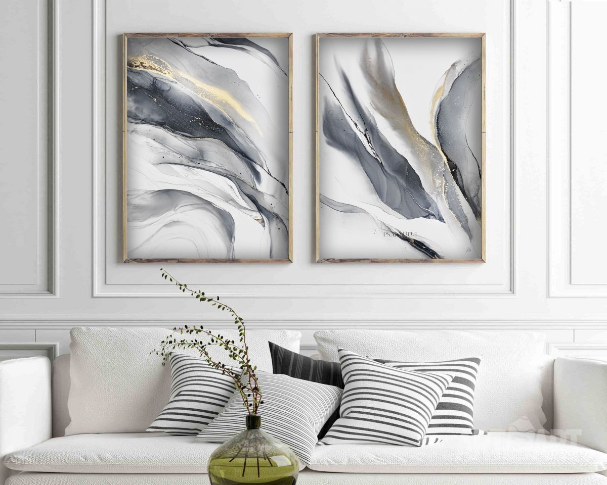 флюид-арт, алкогольные чернила, картина спиртовыми чернилами, картина с золотом, чёрно-белая картина, серая картина, чёрно-белый диптих, серый диптих