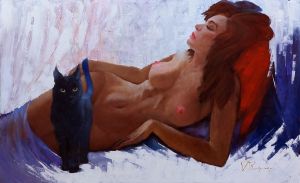 «Картина с лошадью и обнаженной девушкой, купающихся в море. Бегущая .Игра написана на холсте, натянутом на подрамник, масляными красками с использованием кистей и мастихина. Размер 31,4 х 35,4 дюйма ( 80х90 см)».