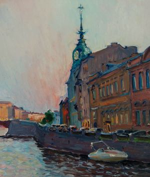 Солнечный день в Санкт-Петербурге. Начало осени. На картине изображен вид на город от набережной реки Фонтанки дом 34. где расположена, популярная у туристов, пристань прогулочных катеров. От этой пристани открывается великолепный вид на широкую реку и город, а в солнечный день он особенно красив.
