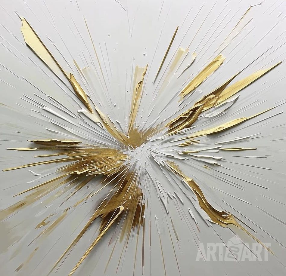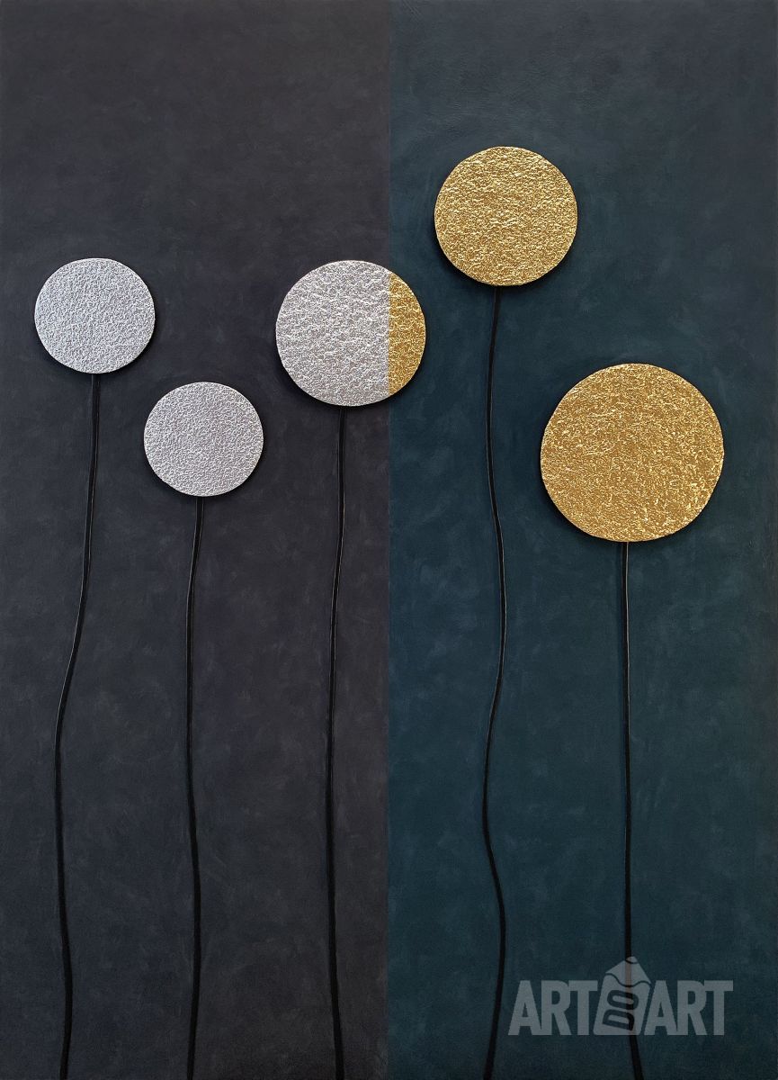 Премиальная картина Водоросли создана в смешанной технике с использованием таких материалов как: акрил, текстурная паста, золотая поталь. Благодаря данным материалам и технике картина выглядит объемной, текстурной, гладкой, глянцевой и блестящей.