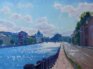 Я написал эту картину на пленэре в двадцатых числах июля, накануне праздника ВМФ . В акватории Невы, как обычно в это время, стояли военные корабли, а причалы величественной реки заполнены туристическими катерами.