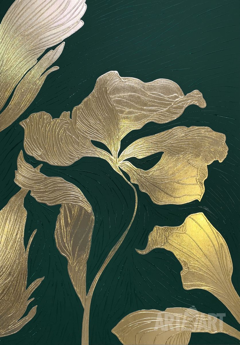 Премиальная картина «Момент» создана в смешанной технике с использованием таких материалов как: акрил, текстурная паста, золотая и серебряная поталь.Благодаря данным материалам и технике картина выглядит объемной, текстурной, гладкой, глянцевой и блестящей.