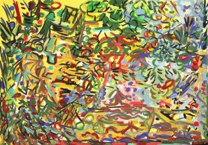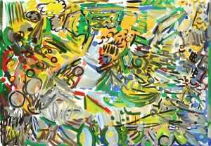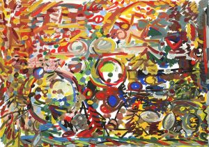 Работа исполнена в стиле Абстрактного экспрессионизма, на бумаге, гуашью.