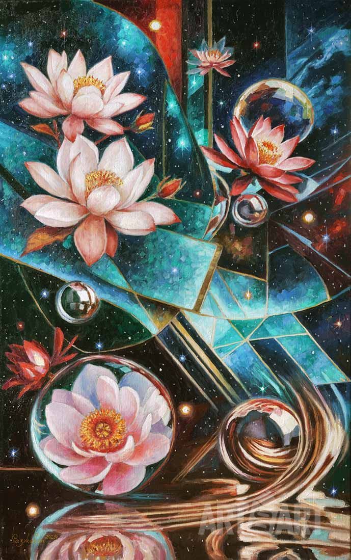 Натюрморт, абстракционизм, орхидеи, ваза, космос, неоновые лампы