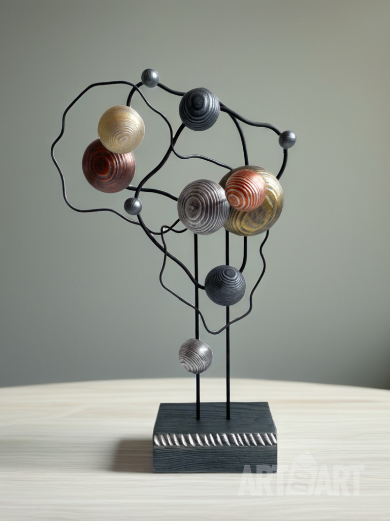 Изучая природные формы и краски, меня очень заинтересовали камни, минералы, кристаллы. Скульптура «Синие и оранжевые кристаллы» входит в серию моих творческих работ «Минералы». Она выполнена из стали и дерева: разные фактуры материалов дополняют друг друга. Произведение создано в единственном экземпляре.