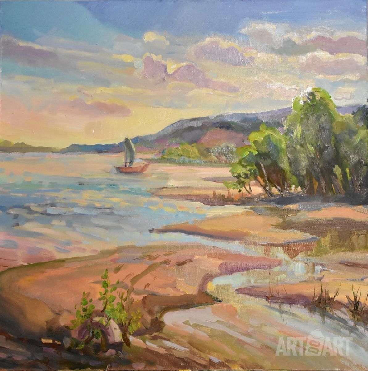 Картина у автора получилась довольно романтичной, нежной. Закатные лучи солнца переливаясь отражаются на водной глади. Картина оставляет на душе ощущения умиротворенности. Очень впечатляют мастерски подобранные сочетания цветов