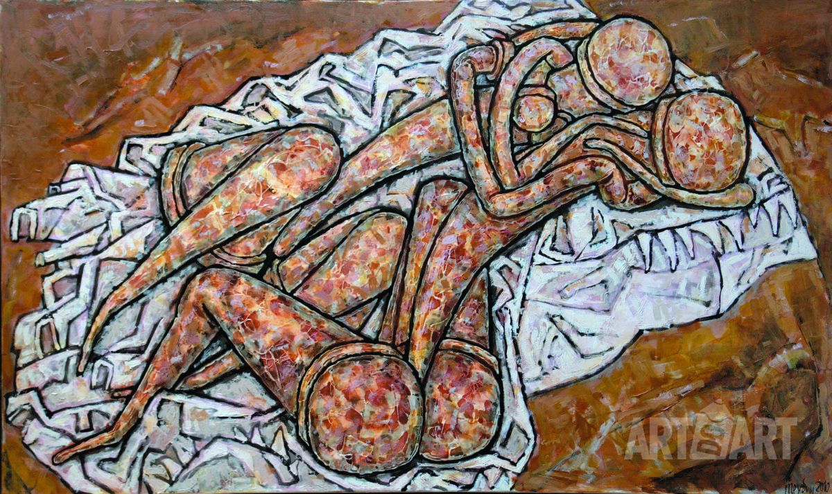 Очень необычная работа. Здесь очень яркие краски которые поднимают настроение. Если всматриваться, то можно увидеть различные элементы, которые помогают смотреть на картину по-новому.