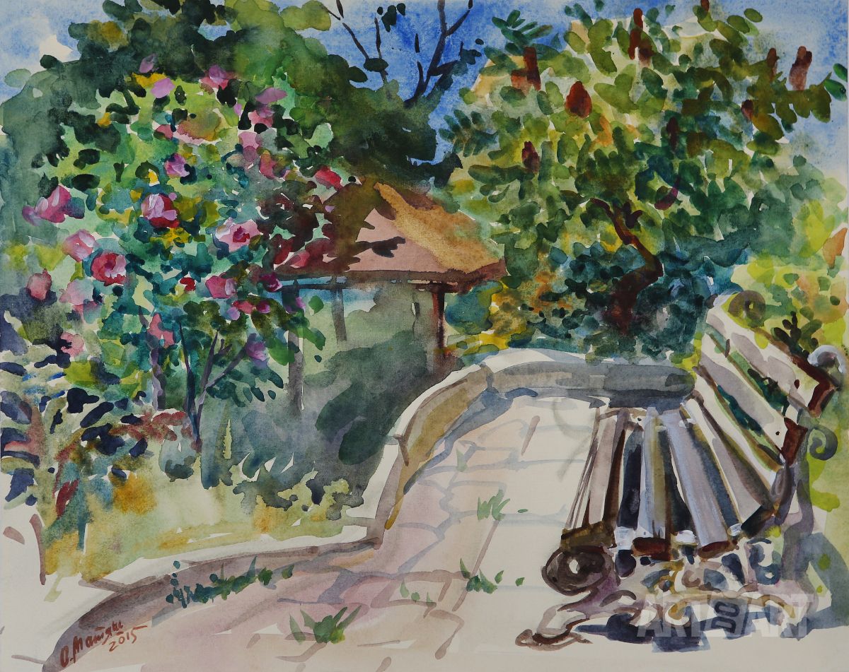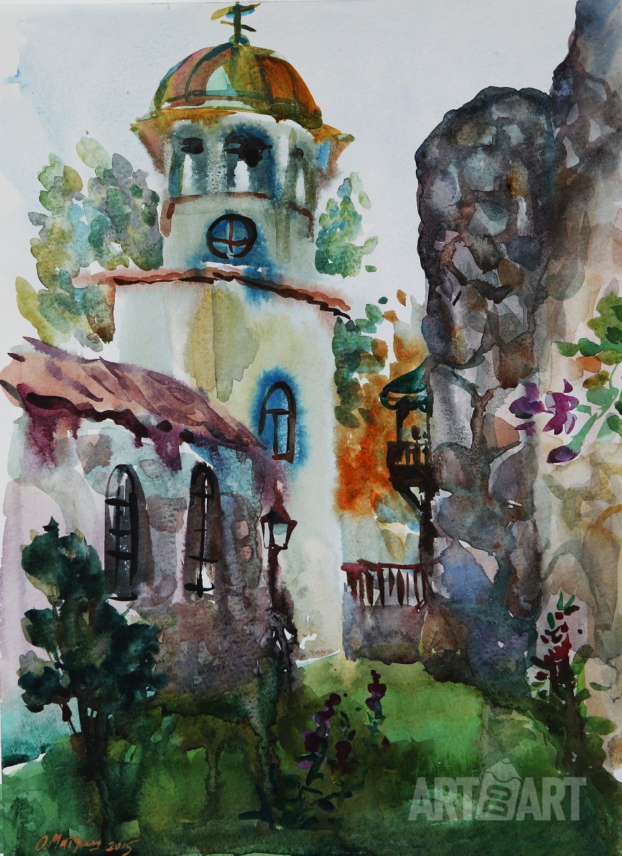 Размер указан вместе с паспарту (ватман). Работа выполнена на специальным образом обработанной бумаге и сверху наклеена на паспарту. Техника создания - авторская, внешне напоминает акварель, но технология и материалы другие.