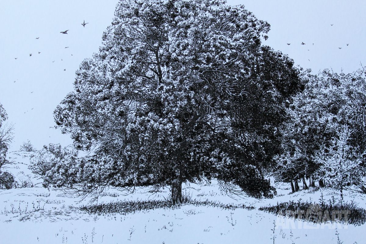 Размер указан вместе с паспарту (ватман). Работа выполнена на специальным образом обработанной бумаге и сверху наклеена на паспарту. Техника создания - авторская с использованием разных материалов, включая шариковую ручку.