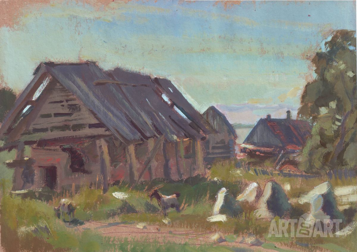 Натурная работа, запечатлевшая длинные тени и теплый свет заходящего солнца, в короткий предвечерний час, за которым наступают летние сумерки. Импрессионистическая работа, написанная темперой, которую так любили русские символисты «Голубой розы».